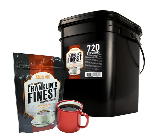 It’s the first ever emergency survival coffee with a true, up to 30-year shelf life*! This kit provides a one-year supply of flavorful Franklin’s Finest Coffee for one person. It’s conveniently packaged in twelve resealable, 60 serving heavy-duty 4 layer zipper pouches for a total of 720 servings.
